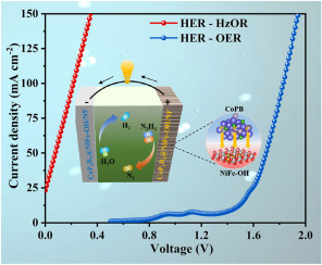 Sustainable H2 production based on hydrogen evolution reaction (HER) and hydrazine oxidation reaction (HzOR) has attracted wide attention due to minimal energy consumption compared to overall water electrolysis. The present study focuses on the design and construction of heterostructured CoPB@NiFe-OH applied as efficient bifunctional catalysts to sustainably produce hydrogen and remove hydrazine in alkaline media. Impressively, CoPB@NiFe-OH heterointerface exhibits an HzOR potential of -135 mV at the current density of 10 mA cm-2 when the P to B atom ratio was 0.2, simultaneously an HER potential of -32 mV toward HER when the atom ratio of P and B was 0.5. Thus, hydrogen production without an outer voltage accompanied by a small current density output of 25 mA cm-2 is achieved, surpassing most reported catalysts. In addition, DFT calculations demonstrate the Co sites in CoPB upgrades H* adsorption, while the Ni sites in NiFe-OH optimizes the adsorption energy of N2H4* due to electron transfer from CoPB to NiFe-OH at the heterointerface, ultimately leading to exceptional performance in hydrazine-assistant water electrolysis via HER coupled with HzOR.