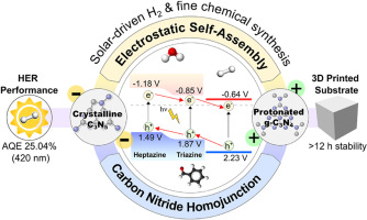 Homojunction engineering is a promising modification strategy to improve charge carrier separation and photocatalytic performance of carbon nitrides. Leveraging intrinsic heptazine/triazine phase and face-to-face contact, crystalline C3N5 (CC3N5) was combined with protonated g-C3N4 (pgCN) through electrostatic self-assembly to achieve robust 2D/2D homojunction interfaces. The highest photocatalytic performance was obtained through crystallinity and homojunction engineering, by controlling the pgCN:CC3N5 ratio. The 25:100 pgCN:CC3N5 homojunction (25CgCN) had the highest hydrogen production (1409.51 μmol h-1) and apparent quantum efficiency (25.04%, 420 nm), 8-fold and 180-fold higher than CC3N5 and pgCN, respectively. This photocatalytic homojunction improves benzaldehyde and hydrogen production activity, retaining 89% performance after 3 cycles (12 h) on a 3D-printed substrate. Electron paramagnetic resonance demonstrated higher ·OH-, ·O2- and hole production of irradiated 25CgCN, attributed to crystallinity and homojunction interaction. Thus, electrostatic self-assembly to couple CC3N5 and pgCN in a 2D/2D homojunction interface ameliorates the performance of multifunctional solar-driven applications.