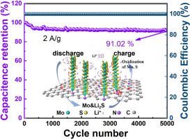 1T-MoS2 nanosheets, with metallic conductivity and high capacity, hold great potential for lithium-ion capacitors (LICs), but suffer from sluggish reaction kinetics due to dense stacking. Herein, 1T-MoS2 nanosheets with enlarged interlayer spacing, vertically bonded to reduced graphene oxide (rGO) (1T-MoS2/rGO), were designed using a hydrothermal-assisted dispersion and intercalation strategy. The active nitrogen species derived from N, N-dimethylformamide (DMF) not only bridge the rGO and MoS2 through strong Mo-N-C bonds to promote the formation of dispersed MoS2 nanosheets, but also intercalate into the MoS2 structure, further enlarging the interlayer spacing. This unique structure synergistically enhances meso- and microscale mass transfer outside and inside of the few-layered nanosheets, significantly improving electrochemical reaction kinetics and reducing the kinetic mismatch between the anode and cathode. Consequently, the resulting-1T-MoS2/rGO achieves a capacity of 500 mAh g-1 after 500 cycles at 5 A g-1 and a high rate performance of 587 mAh g-1 at a high rate of 10 A g-1. Moreover, the assembled 3D vertical 1T-MoS2/rGO//AC LIC delivers a high energy density of 100.3 Wh kg-1 at a power density of 1.0 kW kg-1, and long cycle stability with capacity retention as high as 91.02% after 5000 cycles at 2 A g-1. This work provides a generalizable strategy for engineering two-dimensional material-based electrodes, offering new insights into high-performance energy storage systems.