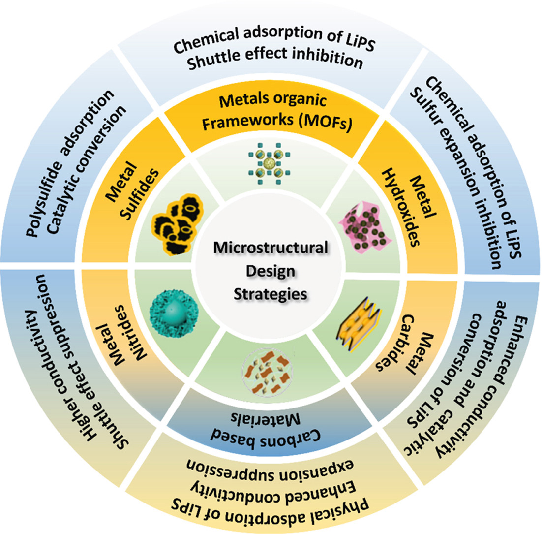 Lithium-sulfur (Li–S) battery has become one of the most promising next-generation electrical storage systems because of its exceptional energy density of 2600 Wh kg−1. However, their commercialization is hindered by several key obstacles, notably the polysulfide shuttle effect, poor electrical conductance of sulfur, and considerable volumetric change during cycling. This review addresses current advancements in microstructural innovations aimed at improving Li–S battery performance, focusing on modifying cathode materials. The strategies discussed primarily revolve around enhancing the conductivity of sulfur and effectively confining polysulfides to reduce the dissolving of lithium polysulfides in organic electrolytes. Key findings highlight the effectiveness of porous carbon structures and metal compounds in stabilizing polysulfides and enhancing electrochemical performances. Additionally, the roles of advanced synthesis techniques that facilitate the creation of hybrid cathodes with superior mechanical properties and cycling stability are summarized. By addressing the inherent limitations of traditional Li–S battery designs, these innovations pave the way for more efficient and reliable energy storage systems, positioning Li–S technology as a viable alternative to conventional lithium-ion batteries in future applications.
