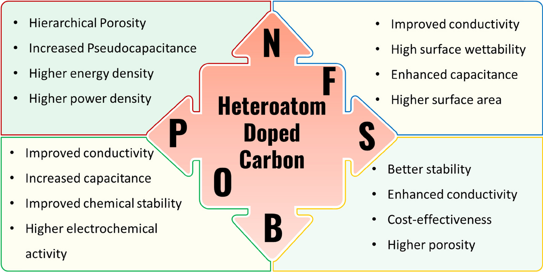 This review focuses on the significant impact of heteroatom doping in enhancing the electronic properties and electrochemical performance of carbon materials for supercapacitors (SCs). Incorporating heteroatoms such as nitrogen, sulfur, phosphorus, fluorine, and boron modifies the carbon structure, creates defects and increases active sites, which improves electronic conductivity, ion accessibility, and surface wettability and reduces ion diffusion barriers. Additionally, certain heteroatoms can participate in electrochemical reactions, further enhancing SC performance. Although research in this area is still emerging, a deeper understanding of the mechanisms behind single and multi-doping systems is essential for developing next-generation materials. Future strategies for improving heteroatom-doped carbon materials include increasing heteroatom content to enhance specific capacitance, selecting suitable heteroatoms to expand the potential window and improve energy density, utilizing advanced in situ characterization techniques, and exploring the use of these materials in cost-effective SCs. The potential of heteroatom-doped carbon materials for SCs is promising, with their ability to improve energy density, power density, and cycling stability, making them competitive with other energy storage technologies. These advancements will be key to broadening their practical applications, including electric vehicles, portable electronics, and grid energy storage, and will contribute to more efficient, long-lasting, and environmentally friendly energy storage solutions.